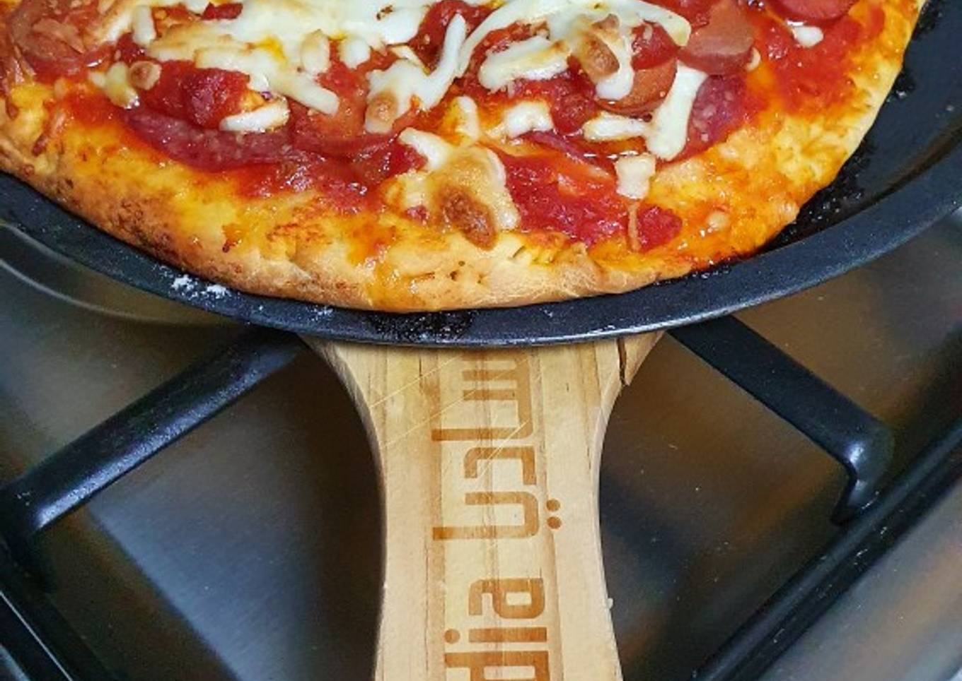 - After the dough has rise, knitted and make it flat use a rolling pin. Then add all the topping ingredients start with the olive oil, bolognaise sauce, salami, cheese, sausage, bolognaise sauce and cheese again. Bake in oven 350f for 30 to 35 minutes.