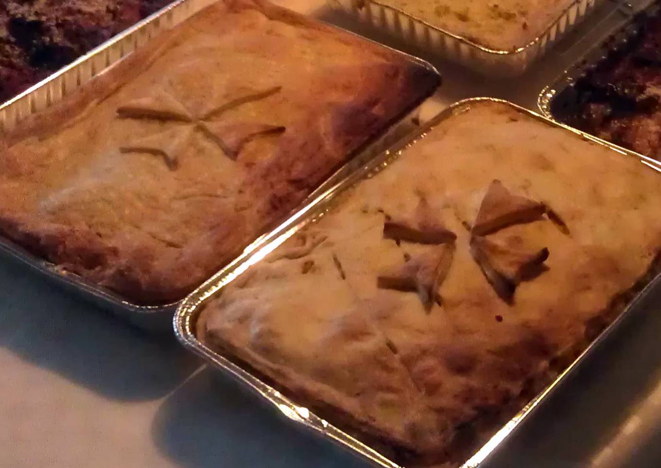 Put in a layer of macaroni mixture. If you cooked chicken livers, arrange these over the macaroni and cover with another layer of macaroni. Cover with pastry. - Bake in oven for an hour at 200° C. or until the top is brown.