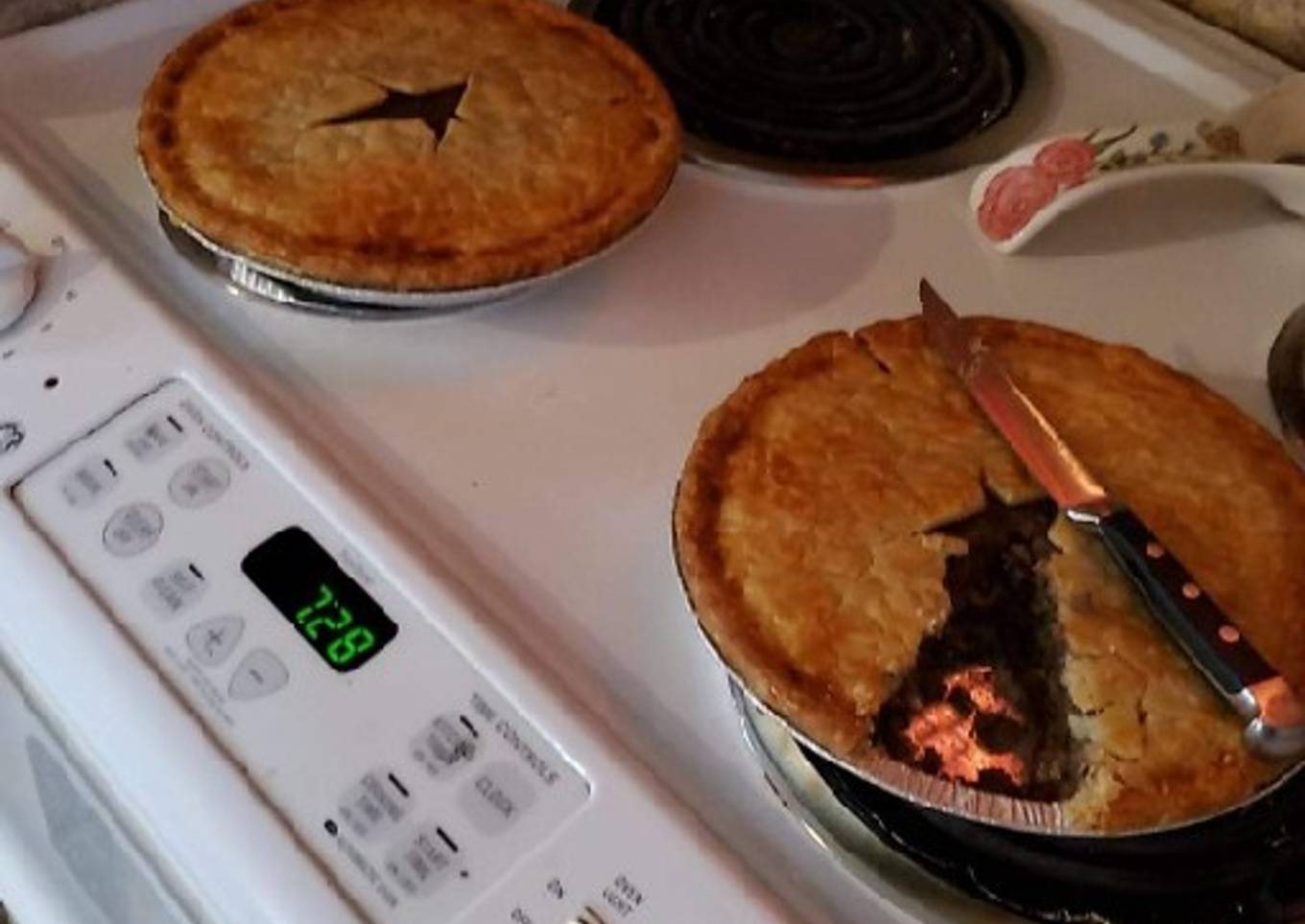 - Add meat and potato mixture to pie shells. Cover with pie crust topping leaving a vent for moisture to escape. Cut out a heart. Lol