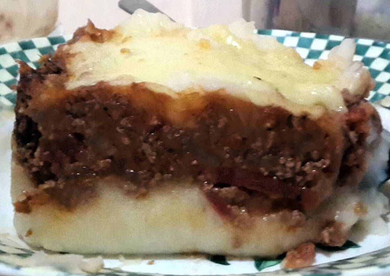 - Put half the mashed potatoes on a pan. Then add the beef mix on top and another layer of mashed potatoes on top. Cover with cheese.