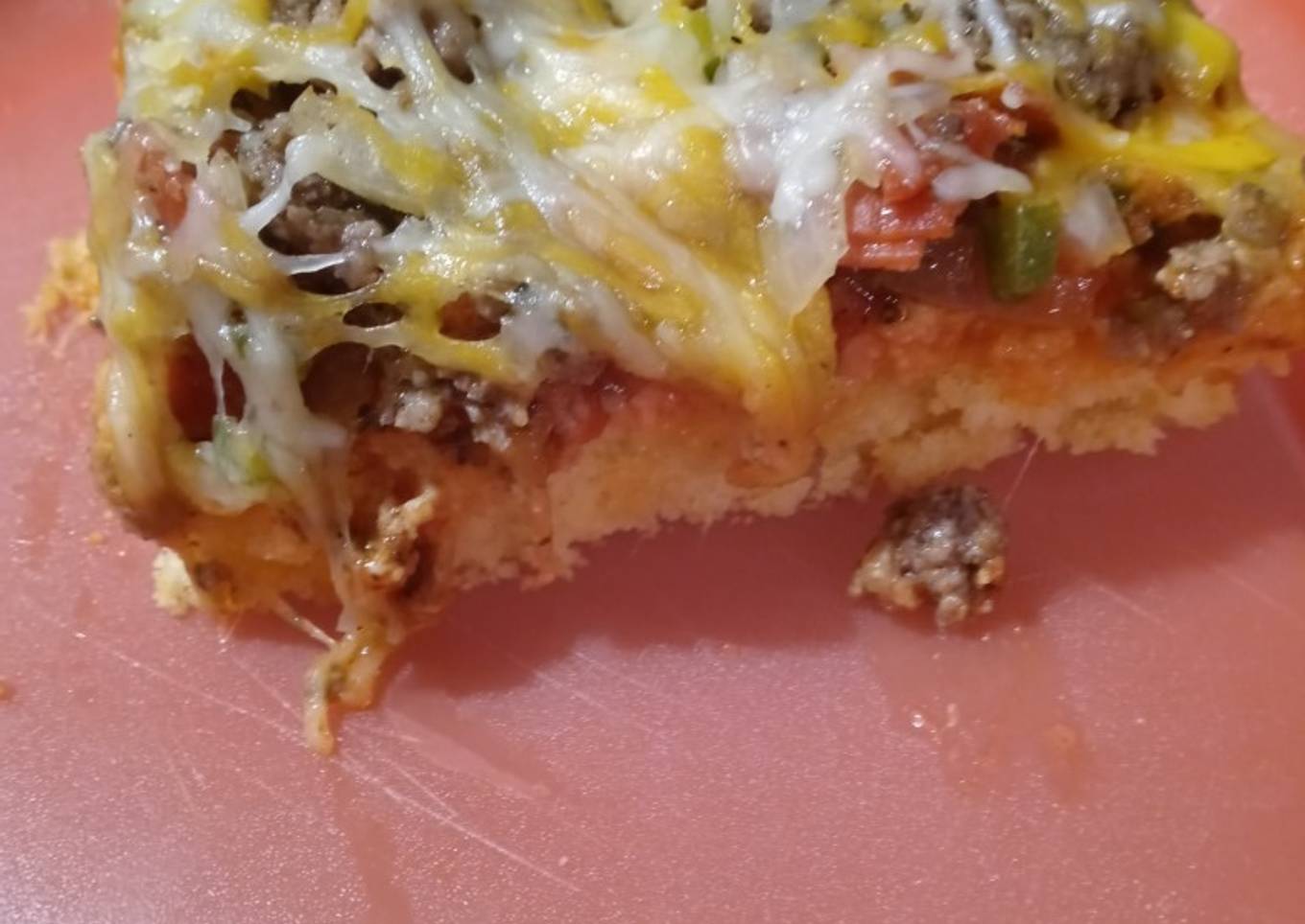 - Pour the jar of pizza sauce over top of cornbread. Then cover sauce with meat mixture (spread out evenly). Top with shredded cheese. Put back into oven and finish baking til cheese is melted and everything is heated through. Serve Immediately and Enjoy 😋.