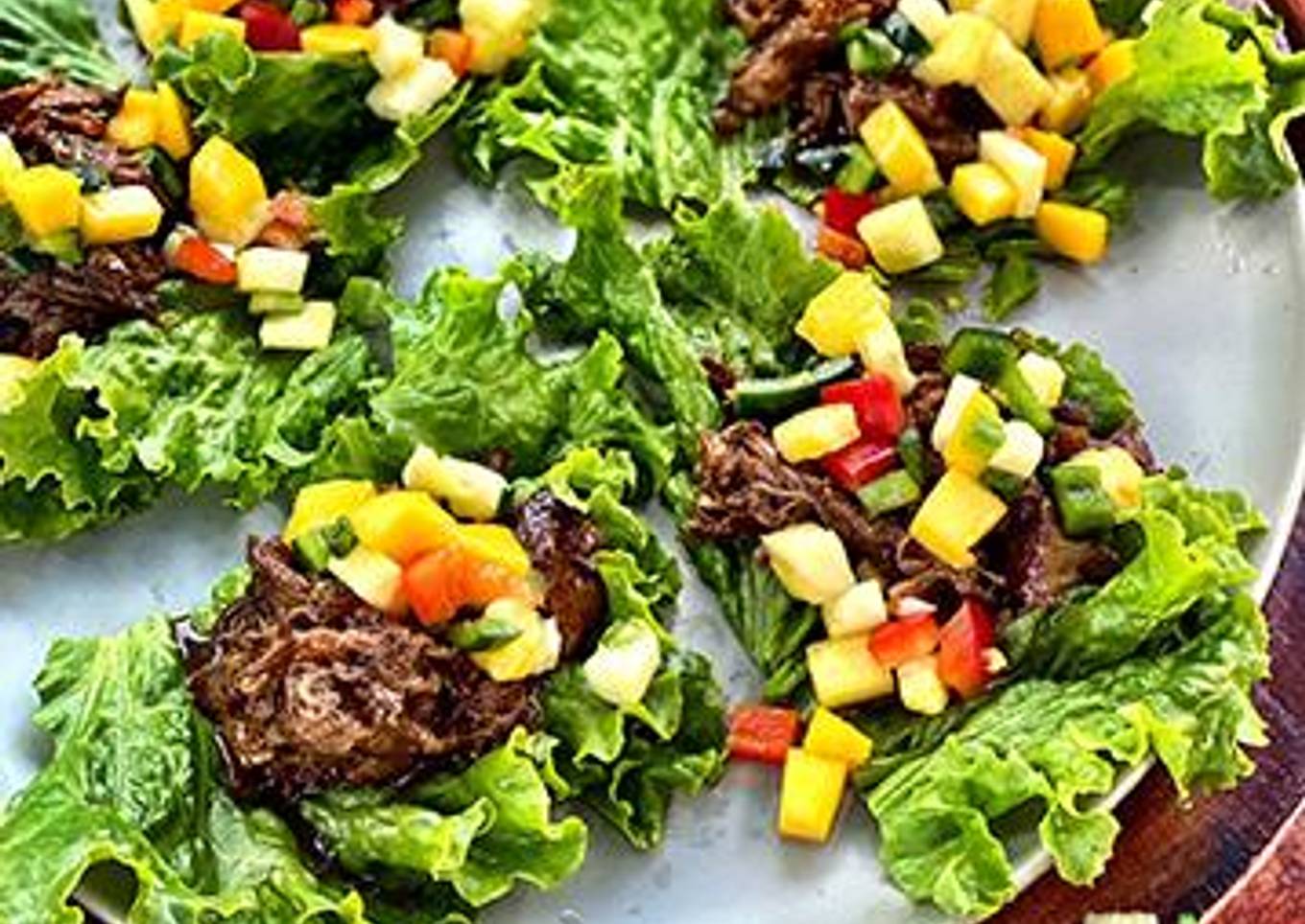 Pull the beef from the Dutch oven, and place it in a bowl.Turn the liquid (remaining in the Dutch oven) up to high heat. Let the liquid reduce down to 2 cups.Strain the braising liquid through a fine mesh strainer.Using 2 forks, shred the braised Wagyu beef in the bowl.Then, fold in the strained braising liquid (so that the liquid and the shredded beef are combined).Lay the lettuce leaves on a large platter. - Top each piece of lettuce with 2 tablespoons of shredded Wagyu beef.Then, add some mango-pineapple salad to each lettuce leaf.Serve immediately, and enjoy!