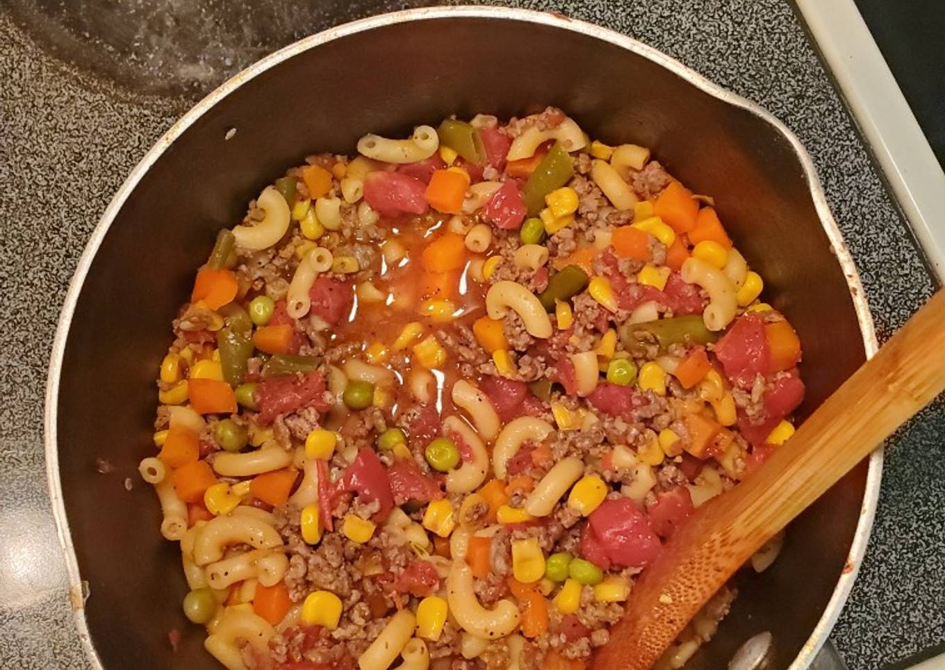 - Add mixed vegetables, tomatoes, broth and pepper into sauce pot with ground beef. Cook covered to a boil, add macaroni reduce heat to a simmer for 10 to 15 minutes.