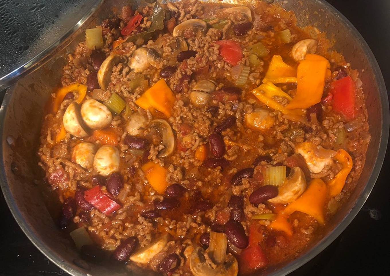 - Add the kidney beans, red pepper and sugar. Add extra water if necessary and simmer for 30 minutes