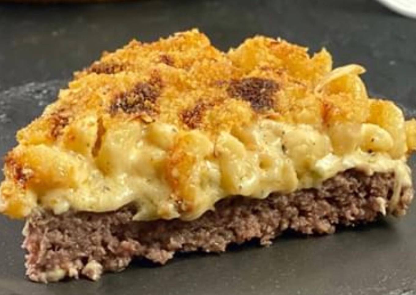 - Press the ground beef in pan then add the Mac and cheese on top spread bread crumbs and Parmesan cheese on top cook at 425 f for 25 minutes broil at the last 5 minutes enjoy 😉