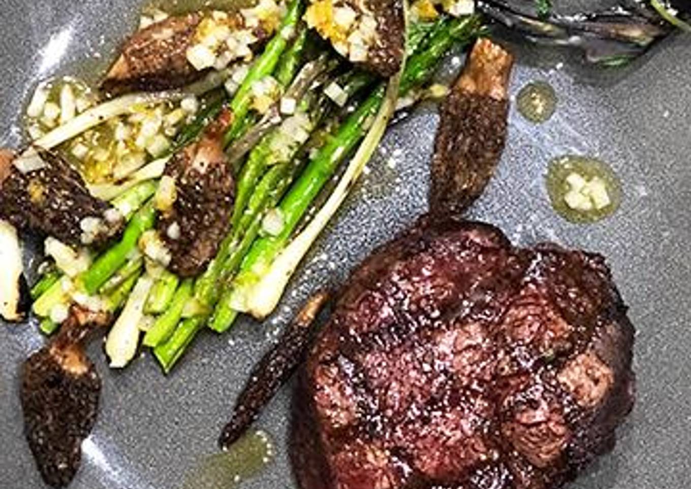 When the fillet has reached 120°F, remove from the heat and allow it to rest for 10 minutes before serving.Plate the Wagyu beef fillet mignon steak with the grilled asparagus, morel mushrooms, and spring onions.Drizzle the Meyer lemon vinaigrette over all of the ingredients, and enjoy!