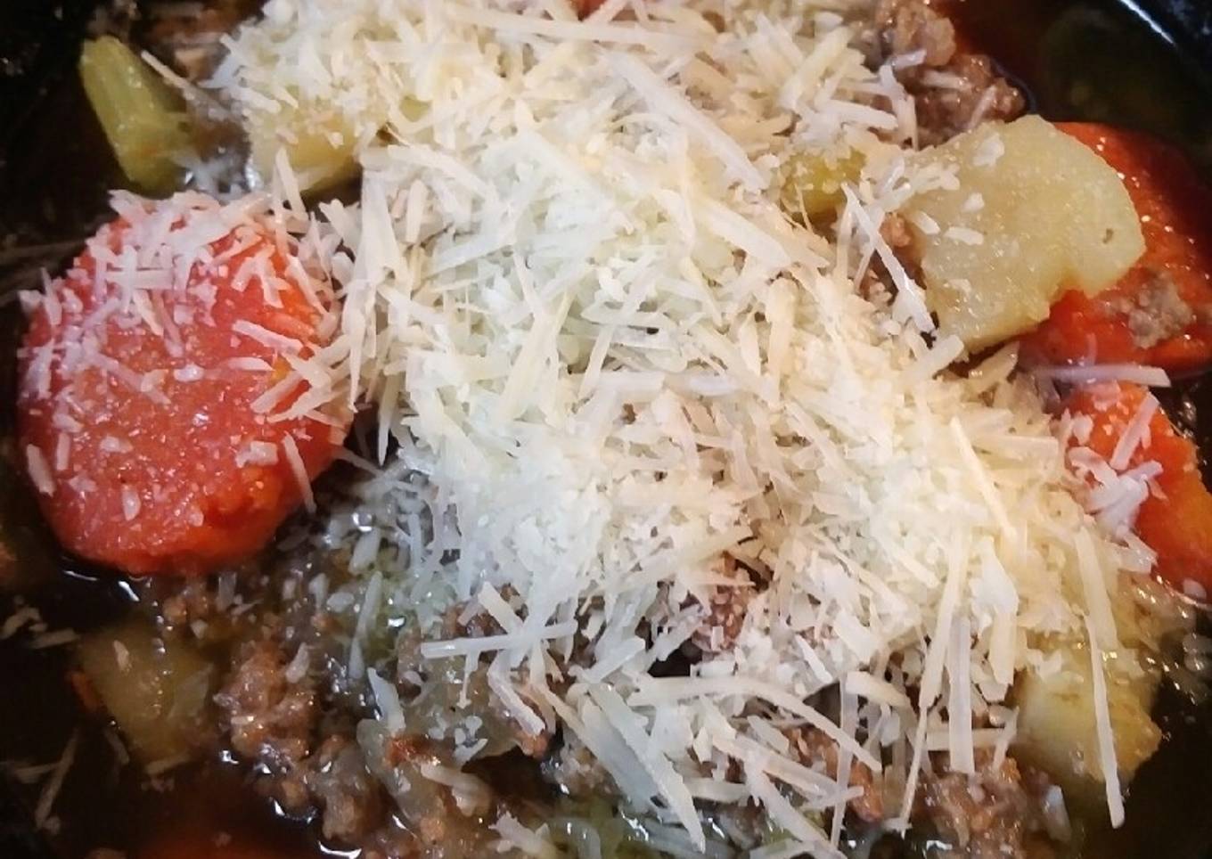 - Brown the beef with the onions, carrots, celery, and Potatoes.