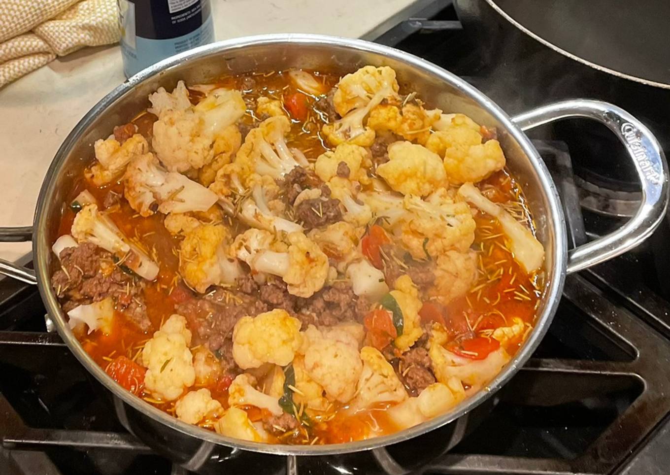 - Add olive oil to large pan. Add cauliflower and sautee. Pour meat sauce on top and add 1 inch of boiling water. Cover and cook for about 20 min, stirring occasionally.