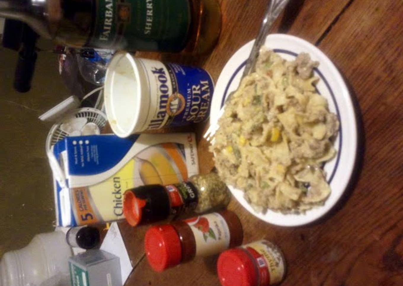 - Combine soup and sour cream and heat on medium. Add beef mixture and stir well until creamy. Add milk to thin out sauce if needed. Add noodles. Serve, enjoy.
