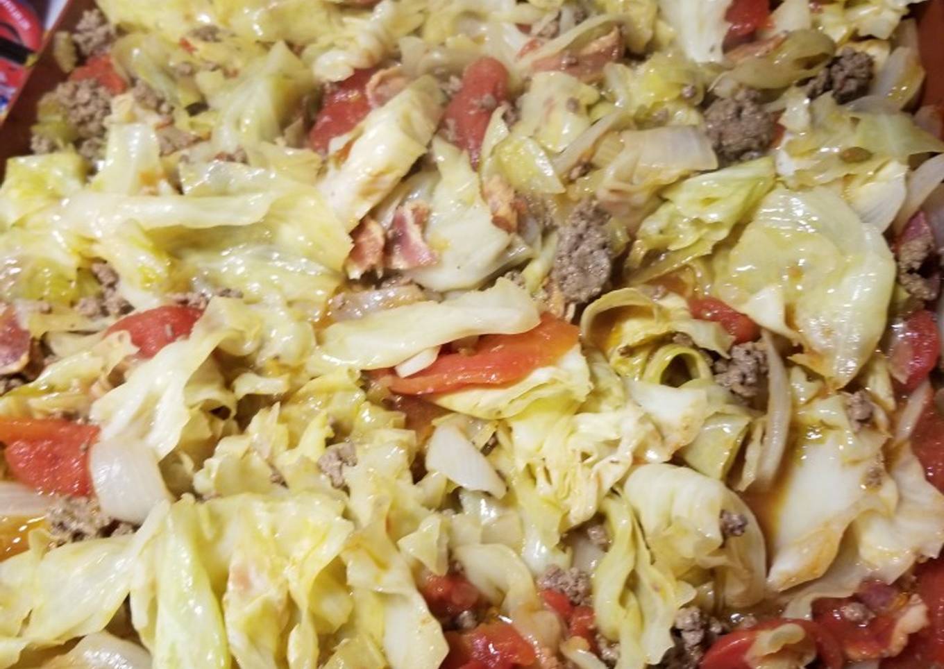 - Cook Bacon. Brown Ground Beef,Onions & Pepper in bacon grease. Cut Cabbage in small pieces. Add to ground beef. Pour stewed tomatoes over top. Crumble bacon into the mixture. Season. Cook till cabbage is tender.