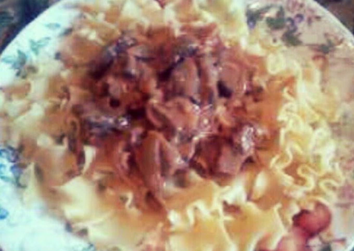 - 1 Cooked buttered noodles (I cook two packages because my husband eats three plates of stroganoff)