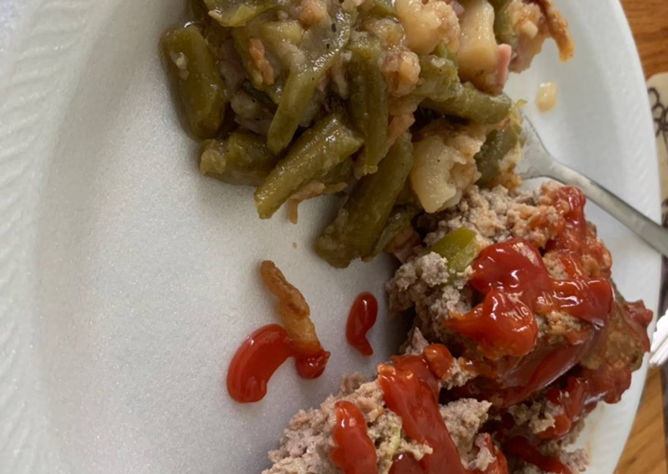 - Remove from oven, pour out excess grease, and add ketchup on top of the loaf.