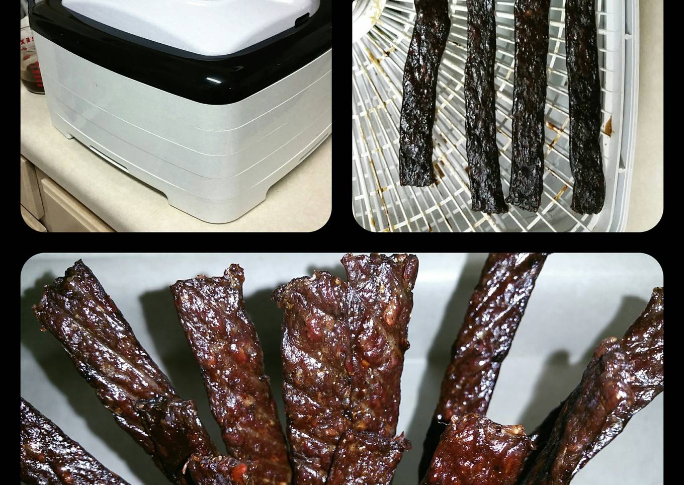 - One last time. Wipe off the excess grease with a paper towel. Flip the jerky strips and wipe again. Baste with sauce and dehydrate for 1 hour.