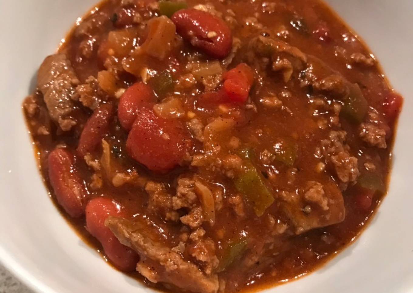This is a hearty chili made with beef sirloin tips and ground beef. If you love a chunky chili like me, this is for you. I use a lot of spice because I think chili should be spicy, but that is up to you. It is perfectly fine in the mild form as well