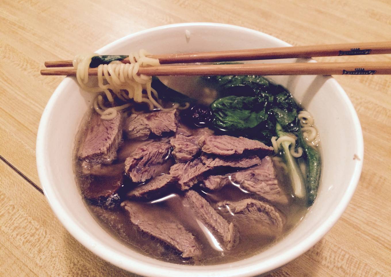 - Now cut the cooked beef into even smaller pieces, blend the beef with noodles and soup all together. Now you are ready for you dinner!