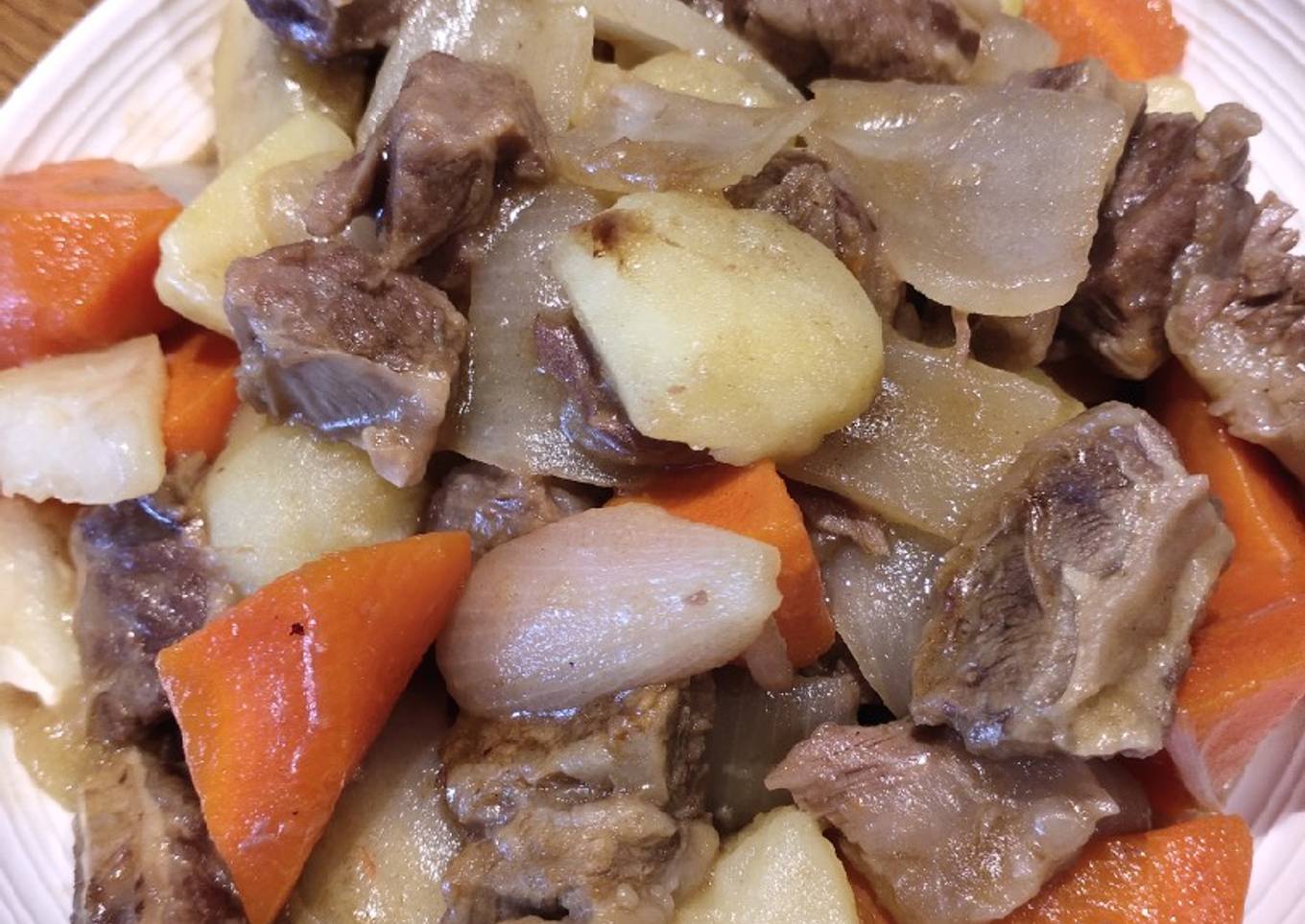 - Sautee onion.until soft.Then.pour beef stir fry until golden.brown then add in.potato and carrot.Cook for five mins then add in.peppercorns and soy and one glass of water.Continue boiling until the beef are tenderbif not.enough water can.add again.Simmer until done