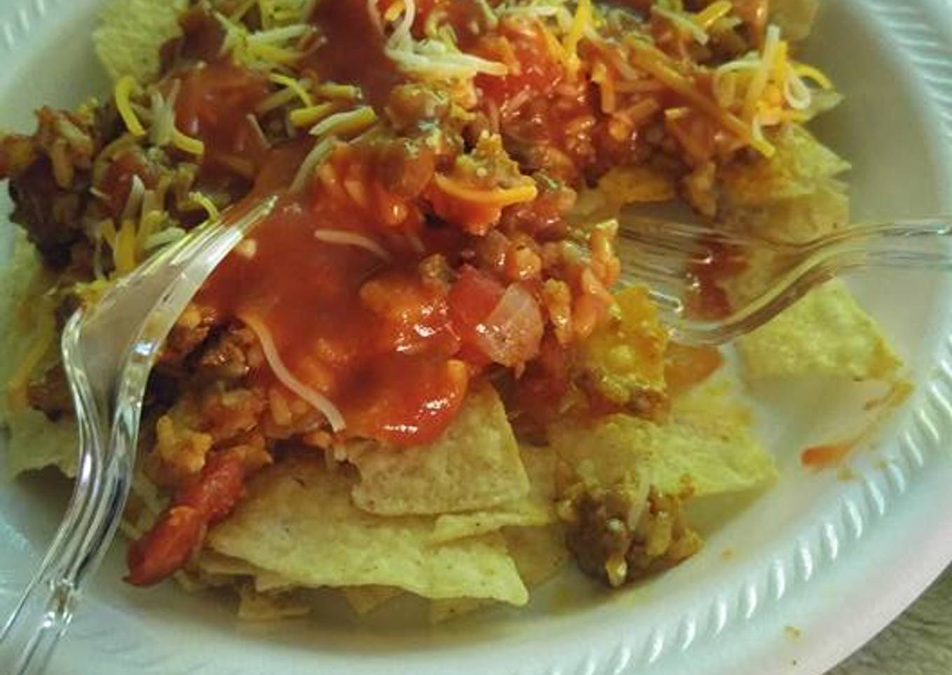 - Sprinkle cheese on top, add your desired amount of taco sauce, and pile it on some tortilla chips!