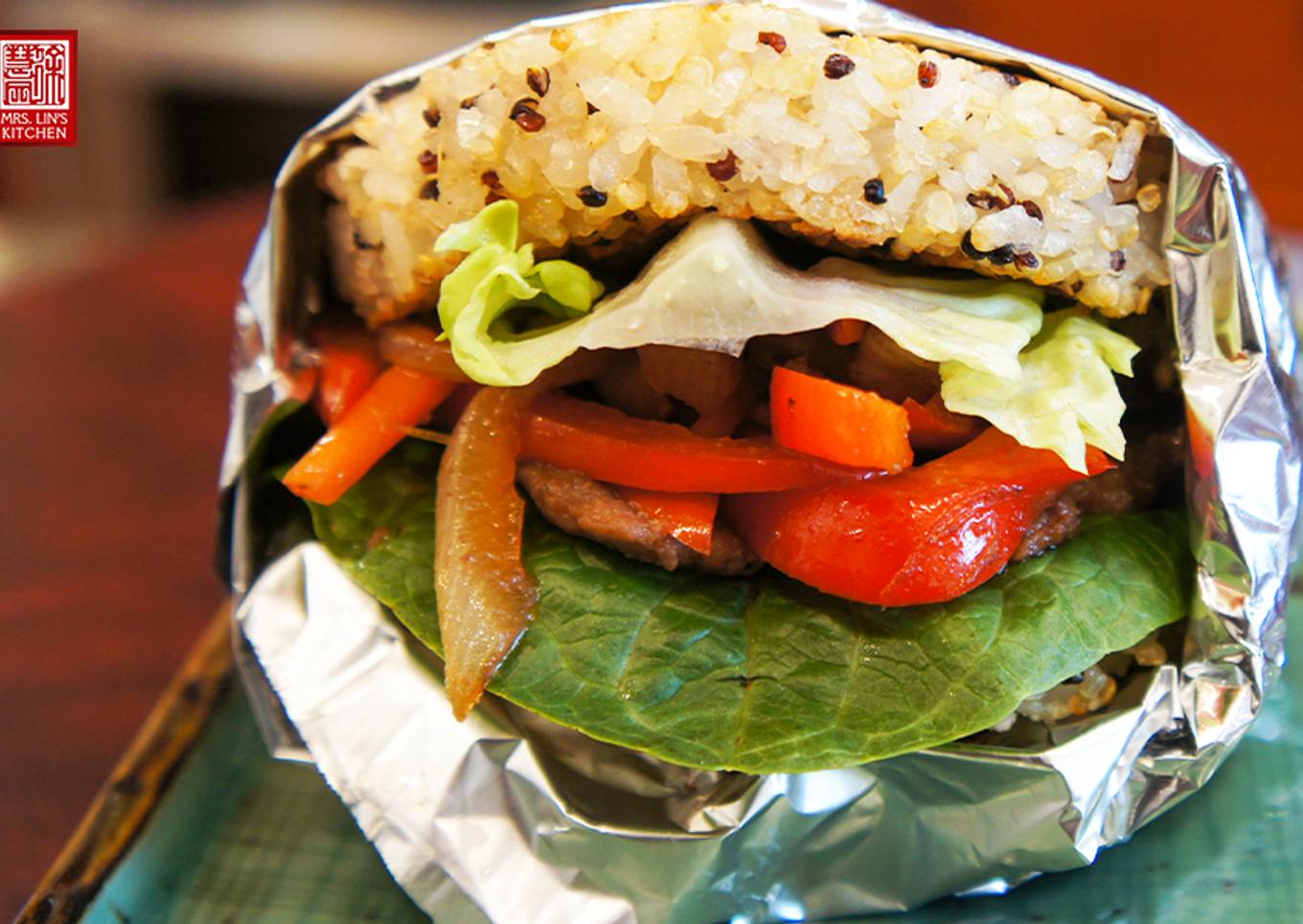 - To assemble the burger: First, cut out a square piece of aluminum foil and fold one corner towards the center. Place 1 rice bun on the aluminum foil.