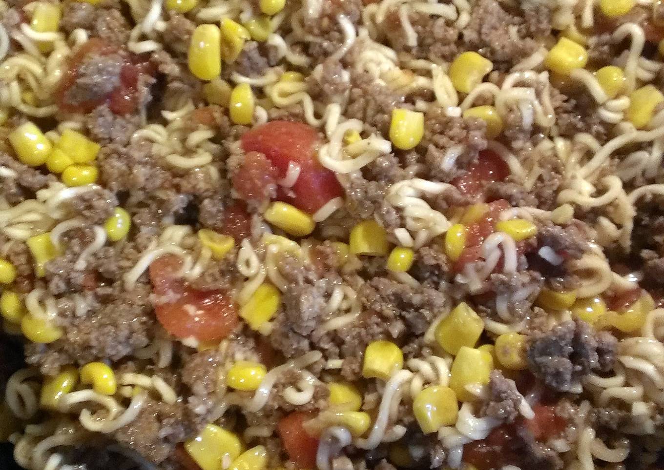 - stir in flavor pack from noodles, tomatoes and corn, slightly break up noodles and add to mixture.