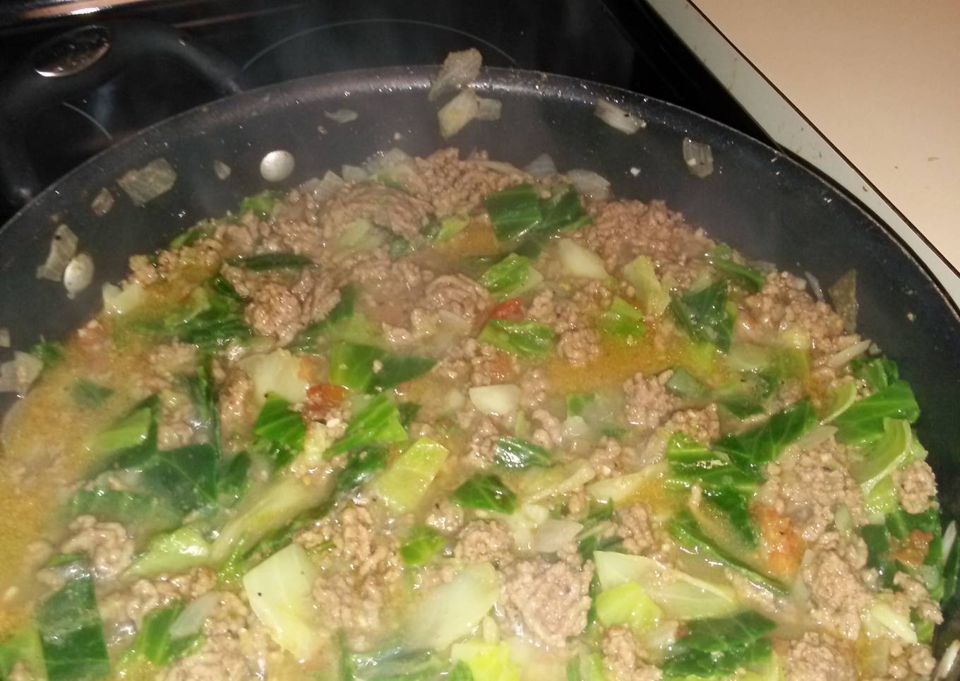 - Drain grease from ground beef. Drain half of cabbage water and add in cabbage and tomatoes.