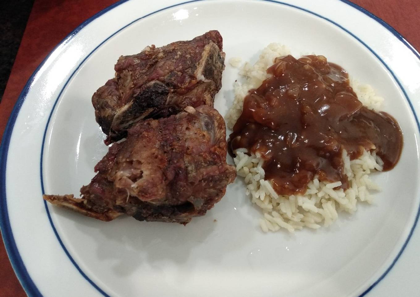 I usually cook these in the IP but wanted a different texture to the meat. Shown here with some rice and onion gravy.
