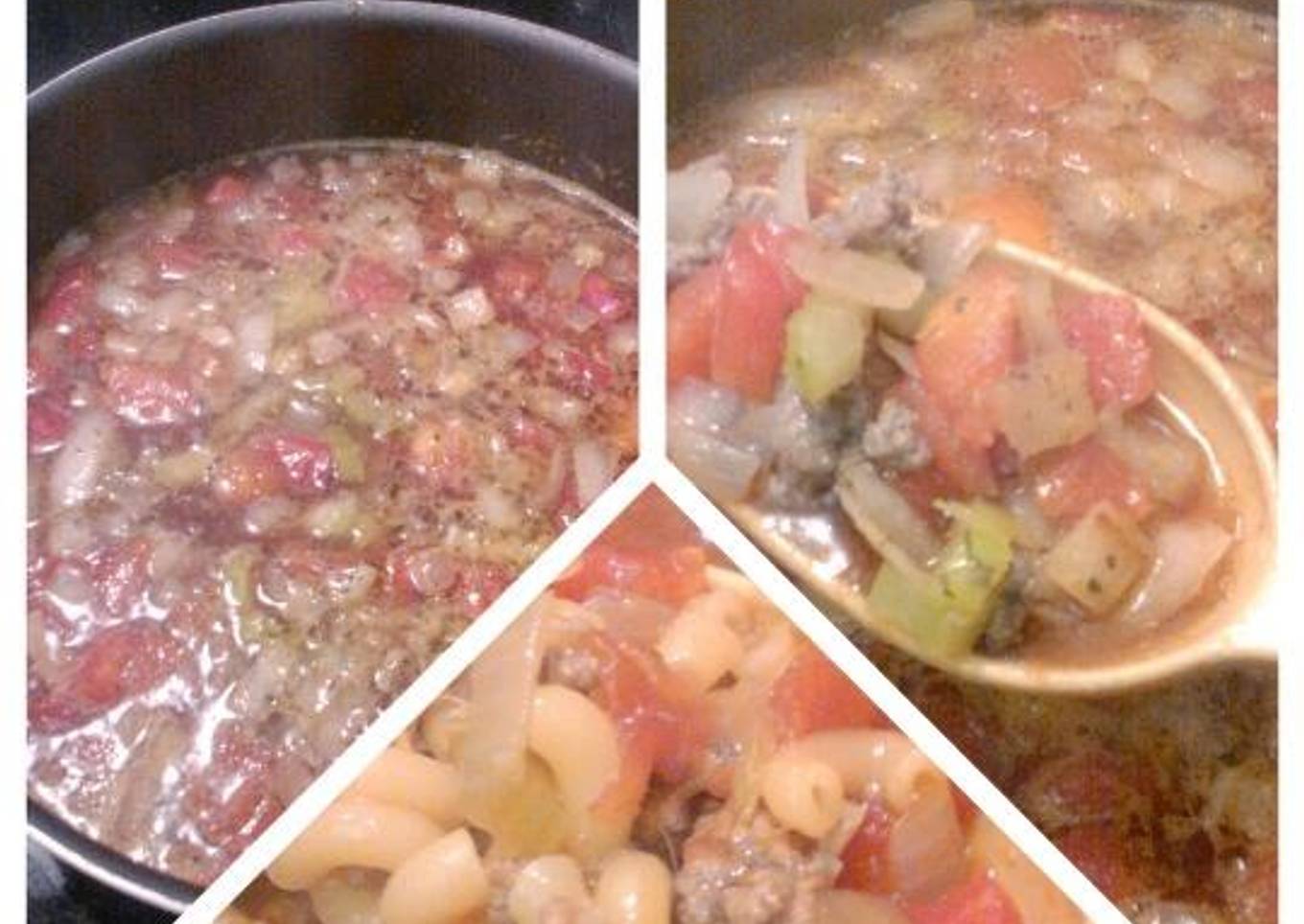 - In a medium frying pan, brown the ground beef, onion and garlic until ground beef is no longer pink, place in a large pot.