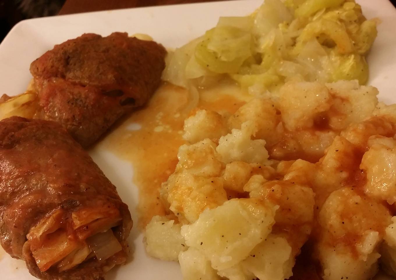 - Set oven to 350°F. Roll a hand full of cabbage and onion into each steak. Then place on baking dish. Place remaining cabbage in onion surrounding them. Set aside.