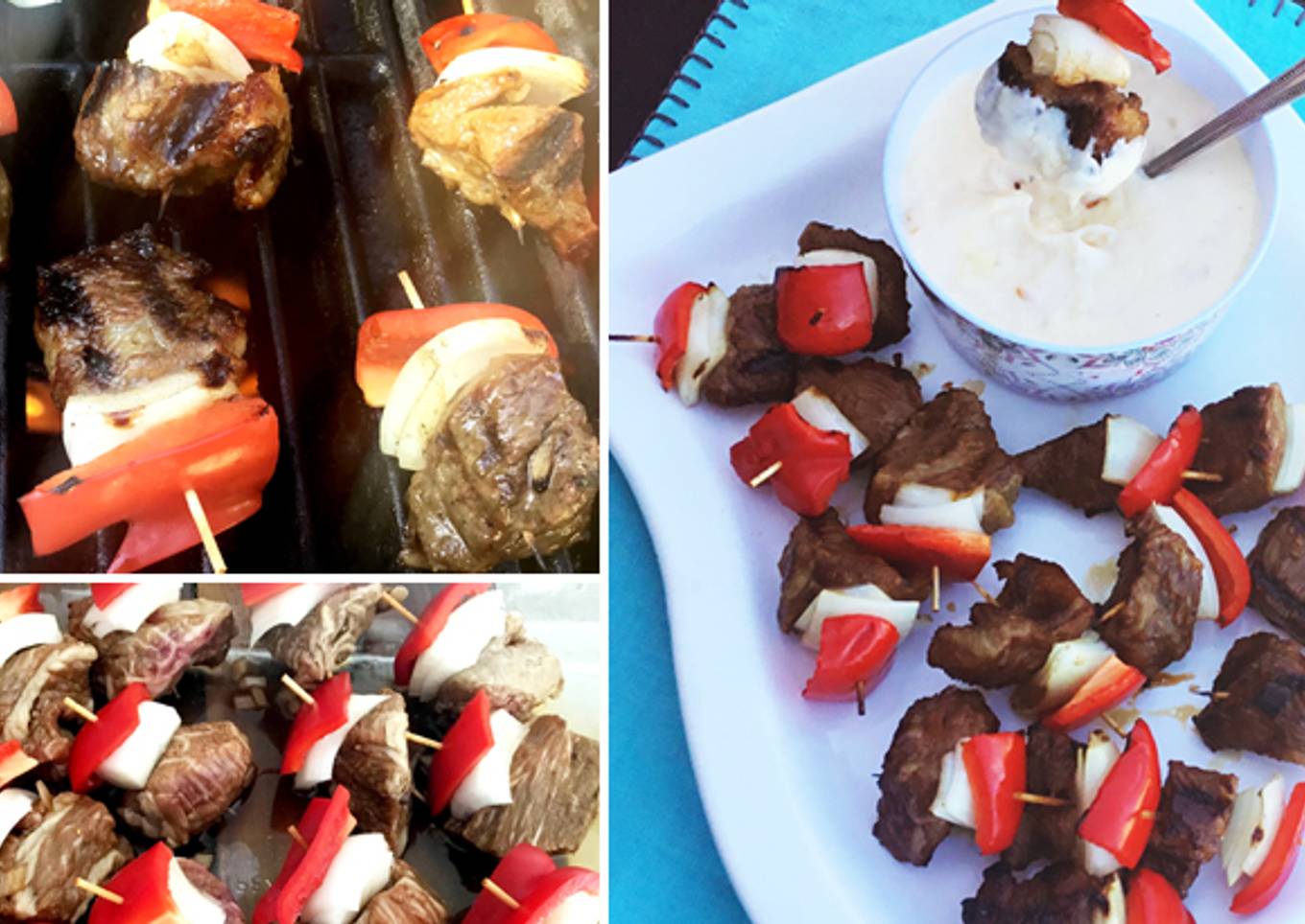 Once the beef is done marinating, drain off the marinade.Cut the red bell pepper and sweet onion into 1 inch cubes.Thread each pre-soaked toothpick with a piece of red bell pepper, a piece or two of sweet onion, and a piece of marinated kabob beef. Let the kabobs sit at room temperature for 30 minutes before grilling. While you’re waiting, make the smokey cheddar sauce (for dipping the kabobs in). - PREPARING THE SMOKEY CHEDDAR SAUCE