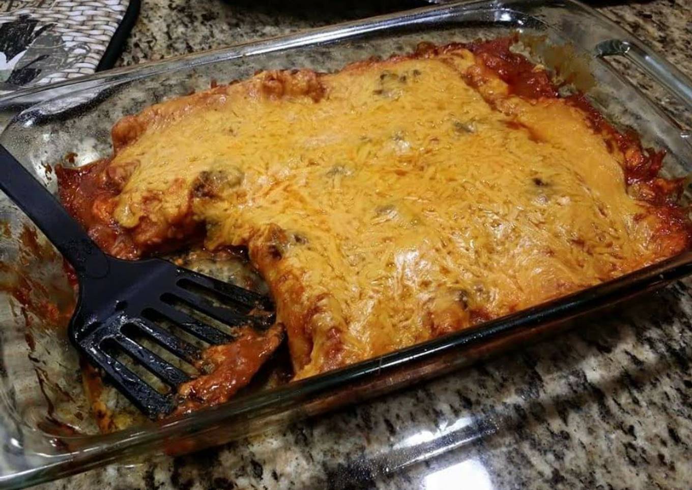 - Ready to assemble. Place ur cheese beef mixture in tortilla roll and seam down in a 9'x13' pan. Add sauce on top and cheese. Bake for 30-40 minutes. Enjoy!!