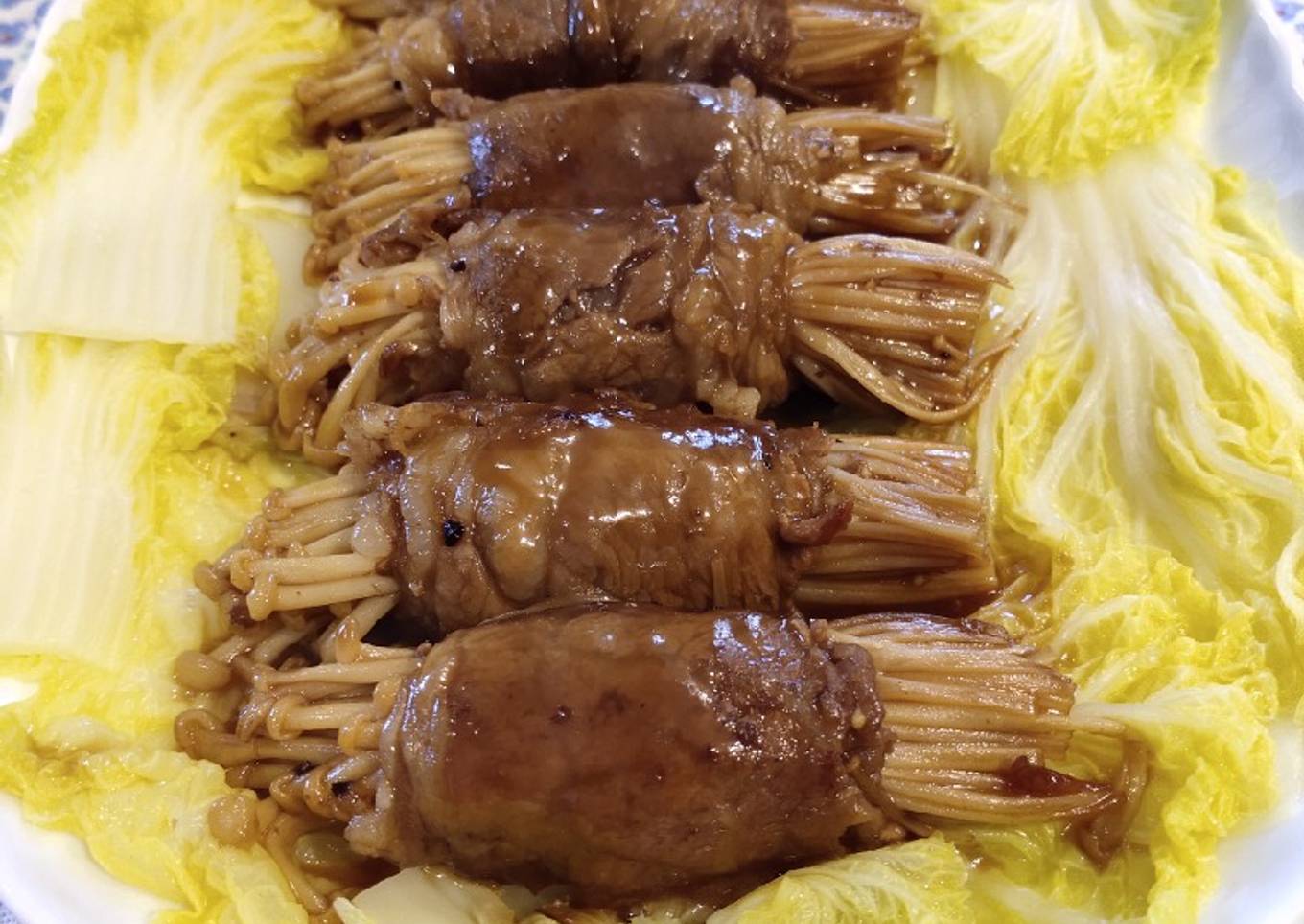 - Wrap enoki mushroom with beef strips.