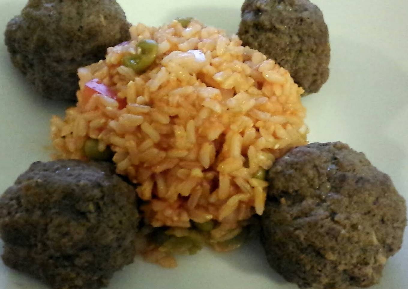 - Plate rice on dish with meatballs around it.
