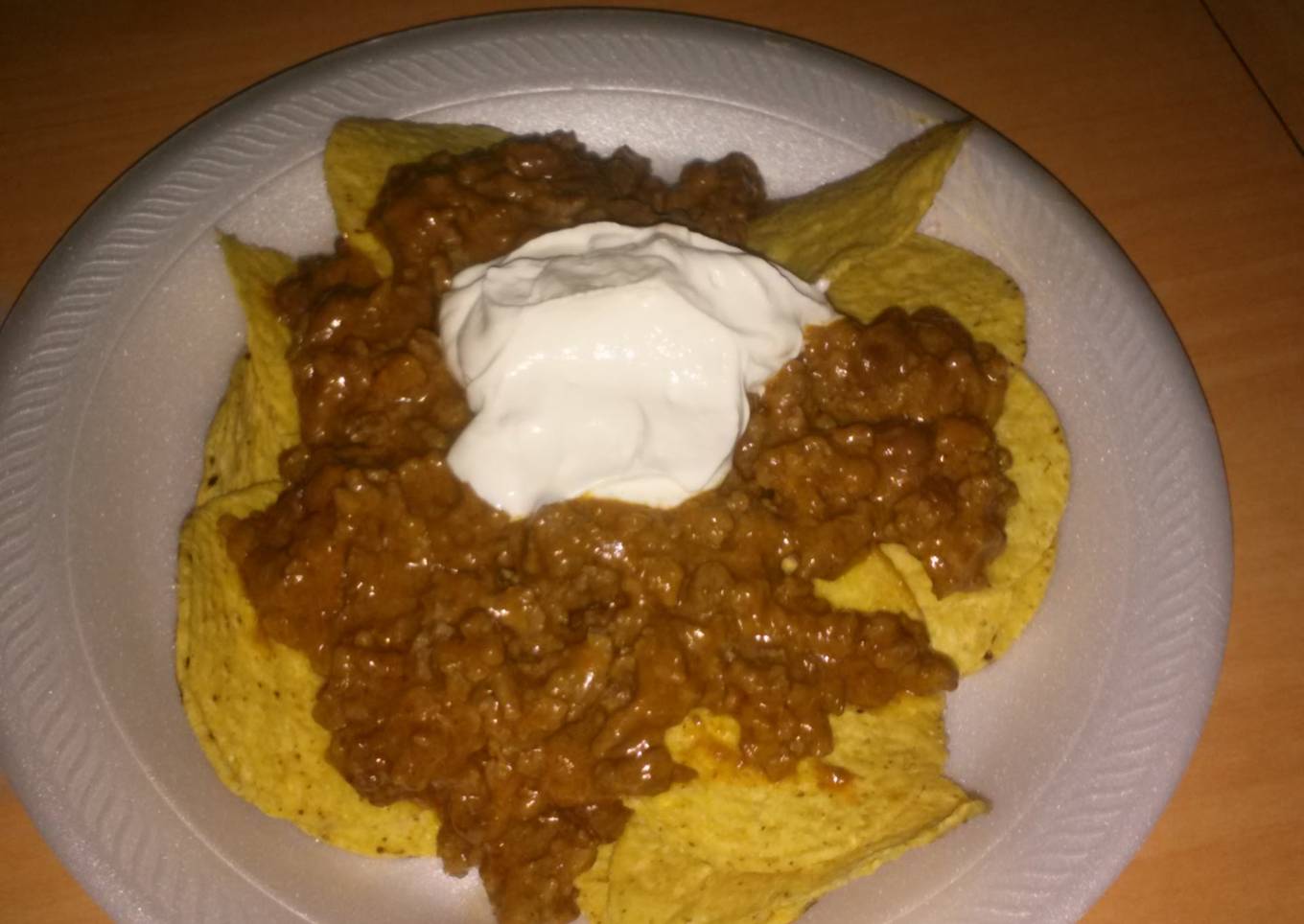 Steps to make Beef chilli beans nachos w sour cream bomb AF!