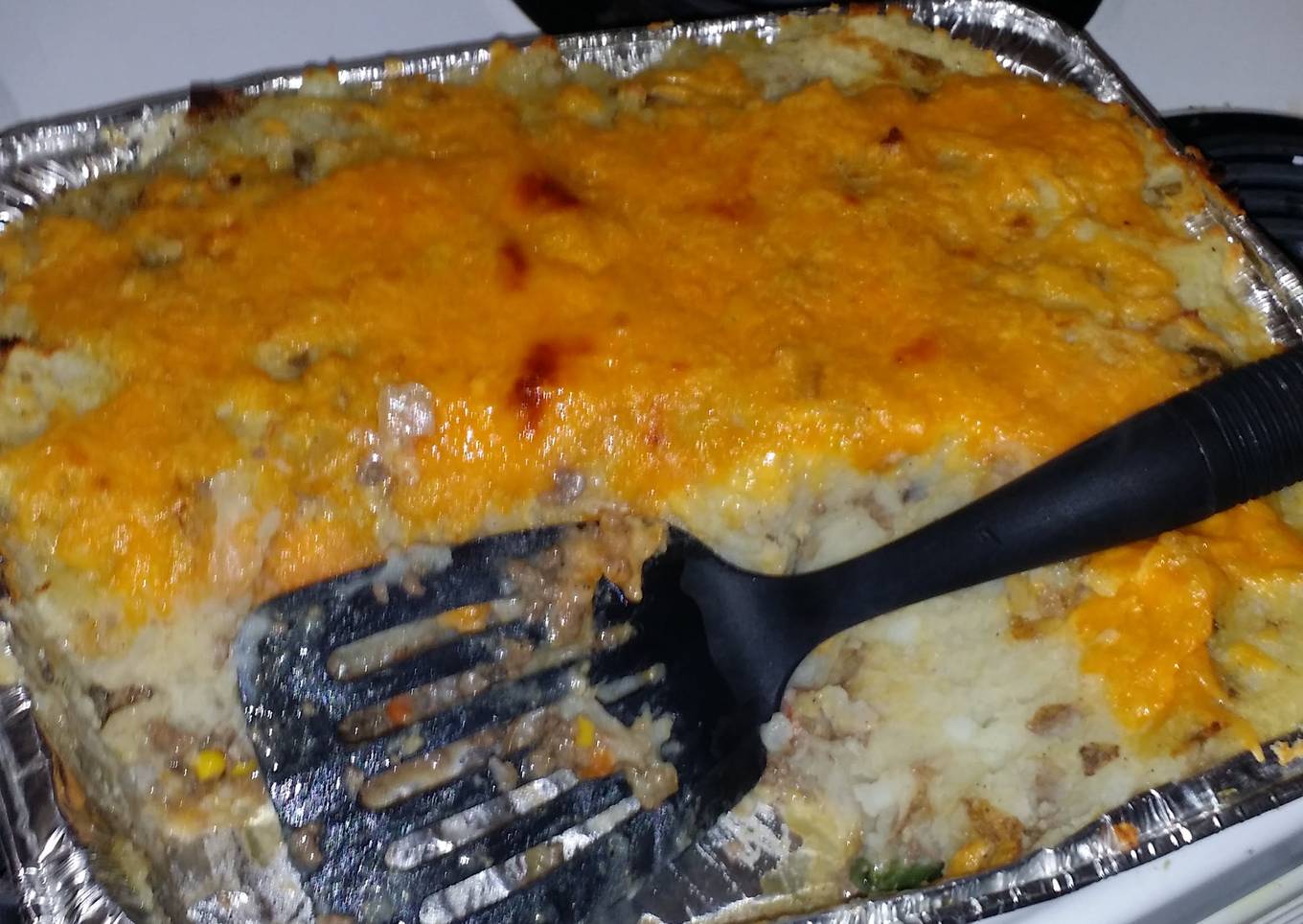 - Layer the beef mixture into an oven safe dish, with the potatoes on top. Evenly sprinkle the cheese atop the potatoes. Bake in the oven at 350 until golden brown and serve.