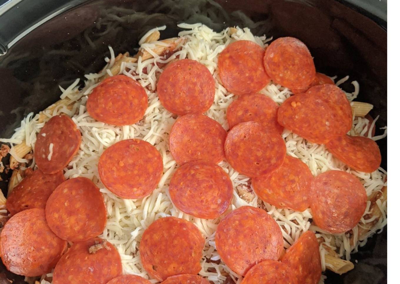 - Brown ground beef drain, cook pasta drain then add pasta and 1 jar of pizza sauce (optional: stir a little sugar into pizza sauce) to meat mix well using a crockpot pour a little pizza sauce to the bottom of pot then add the meat and pasta mixture into the crockpot add cheese to cover the top then layer with pepperoni repeat this step a second time by adding more of the meat and pasta mixture, cheese and pepperoni cook on low in crockpot until cheese is melted