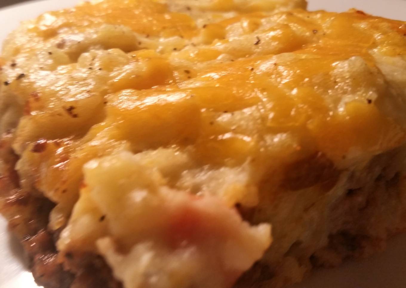 - Spread potatoes over the ground beef mixture inside the pan. Sprinkle the top with cheddar.